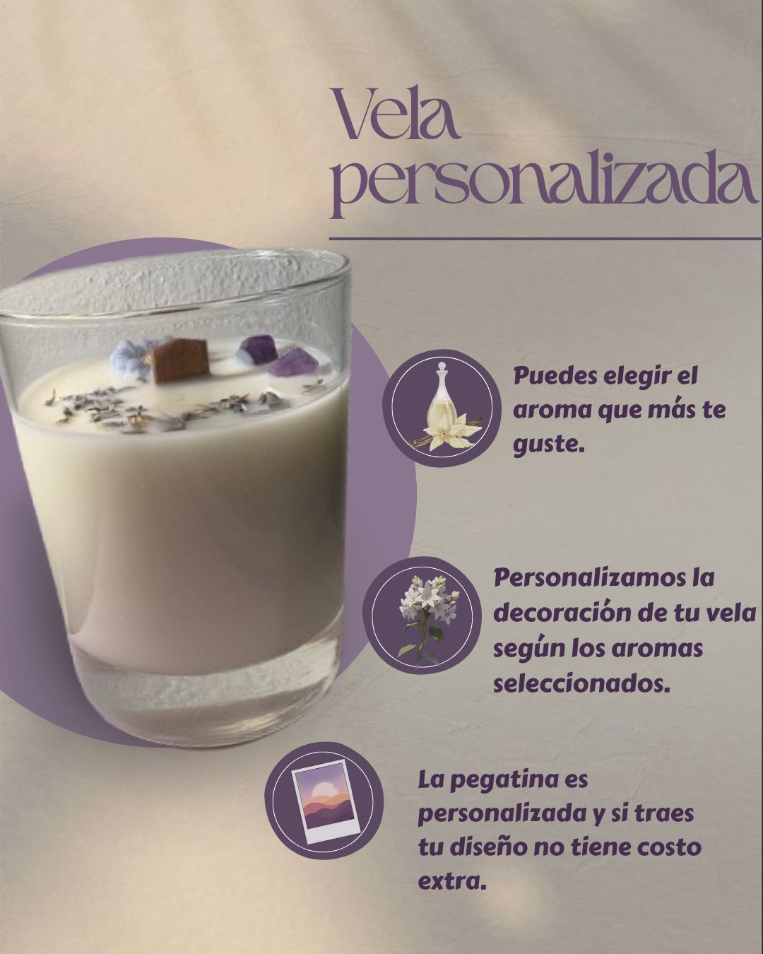 Vela personalizada a tu gusto 🕯️ puedes elegir uno o dos aromas 🌿🍊 y la decoración irá acorde a los olores seleccionados 🌸 La pegatina frontal es de 7×7 cm 📏 y puedes traer tu propio diseño sin ningún coste adicional 🎨 o, si lo prefieres, podemos crearlo nosotros por solo 5€ extra 💛 Crea una vela única con aroma, decoración y diseño totalmente a tu medida.